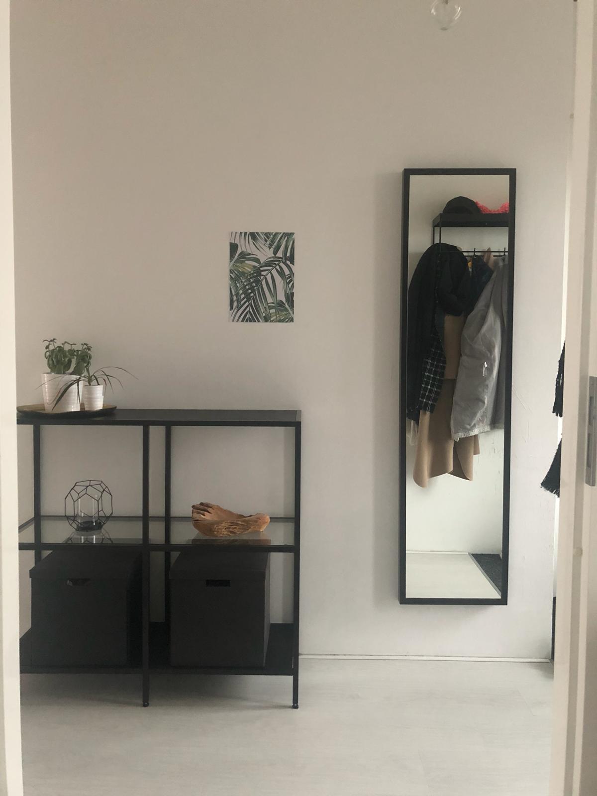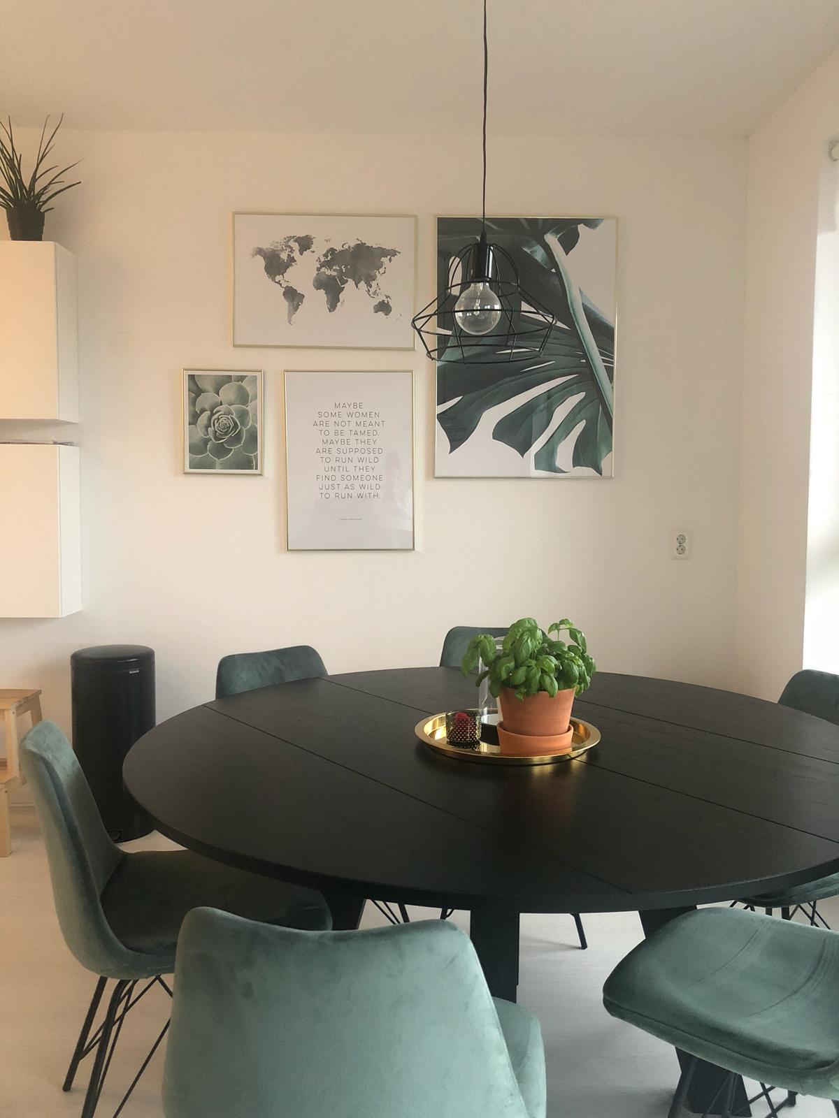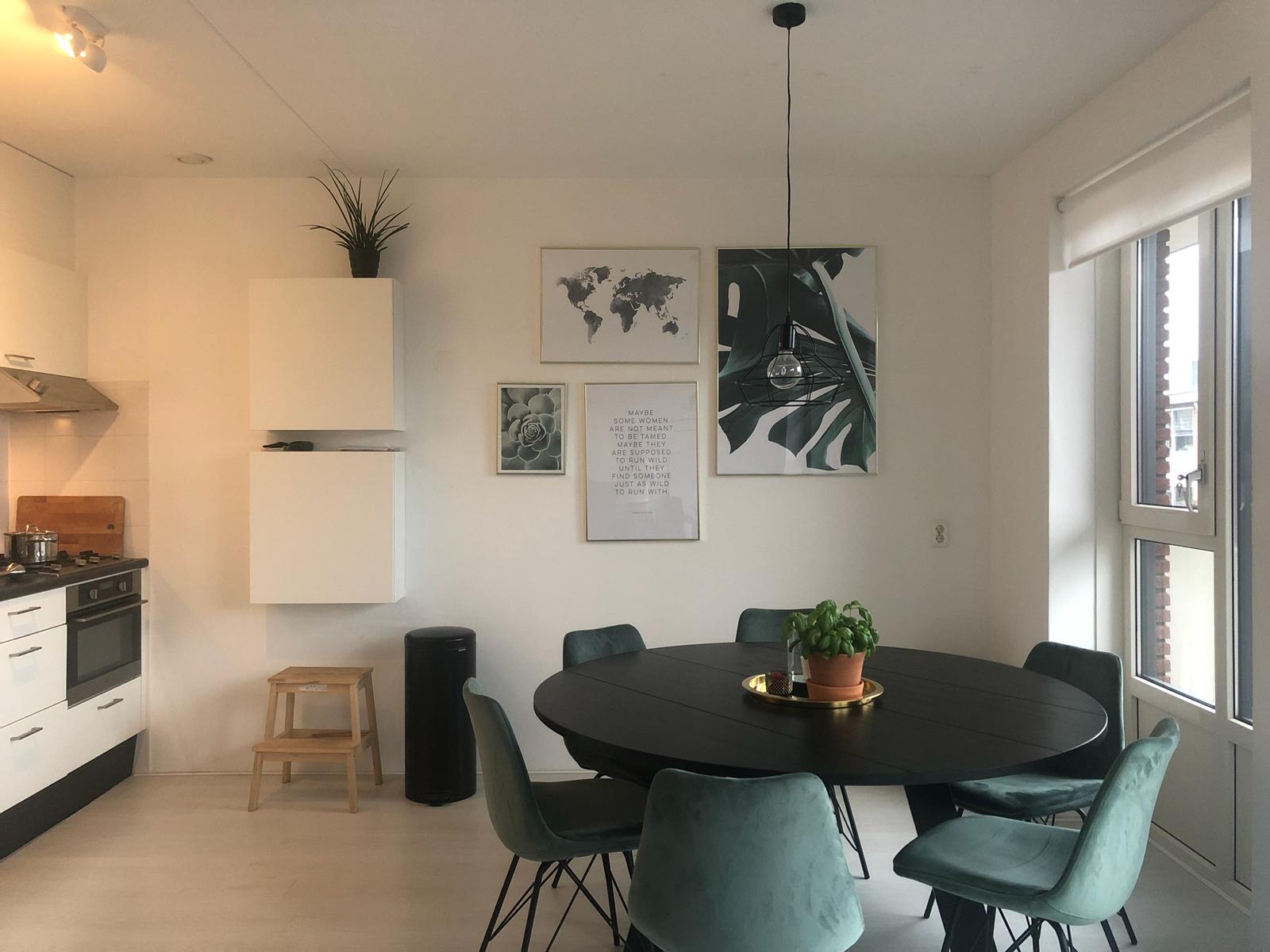 De wens van de huurder van dit appartement in Huissen was om met een klein budget een thuis te creëren. De stijl van het interieur is scandinavisch. Door de geringe oppervlakte goed te benutten is het rustig en ruimtelijk gehouden is er gekozen voor een ronde eettafel met 6 stoelen. De grote bank is meegenomen uit het vorige huis, hierdoor ontstaat een knusse zithoek. De goud accenten geven een luxe uitstraling.