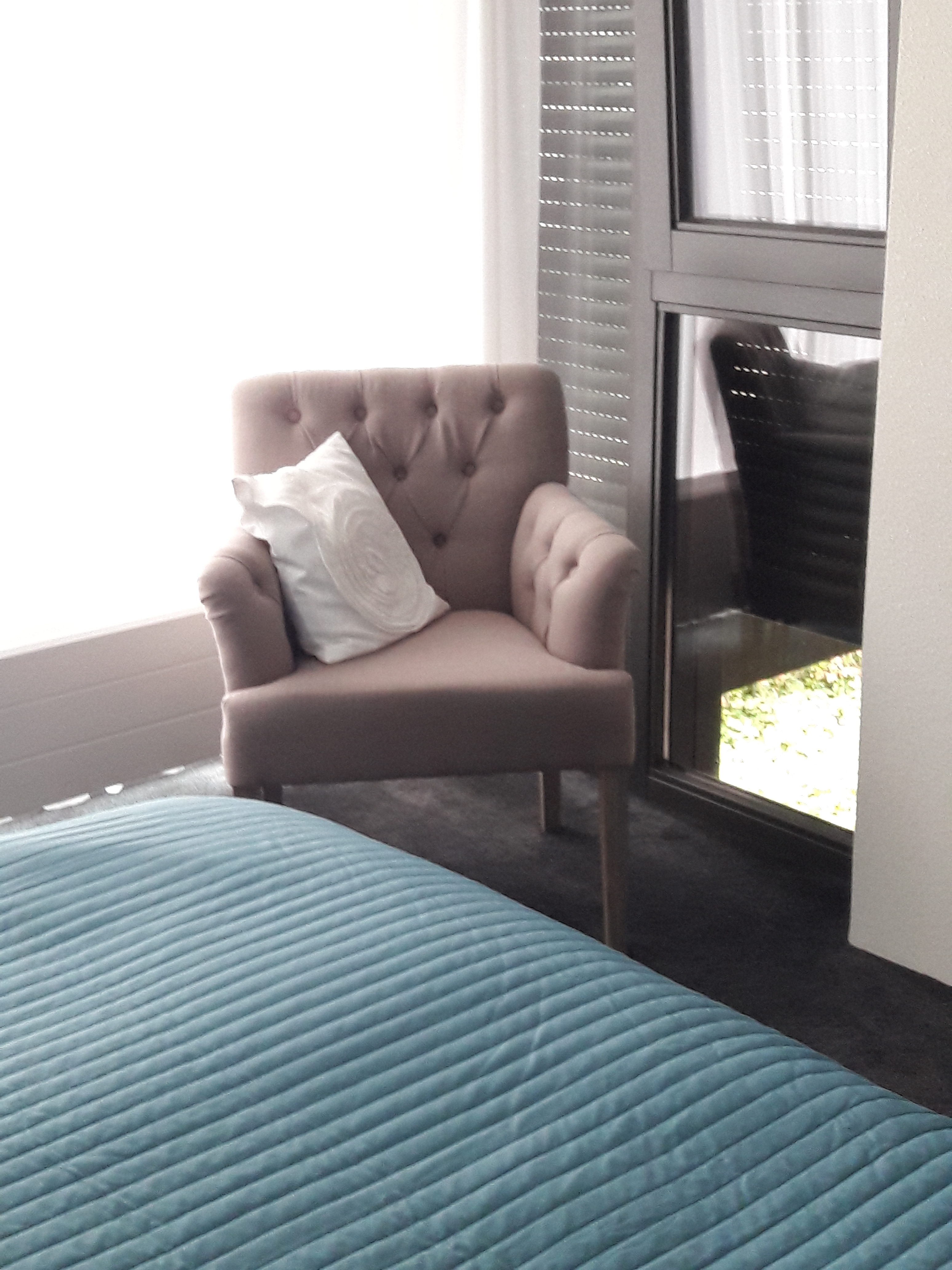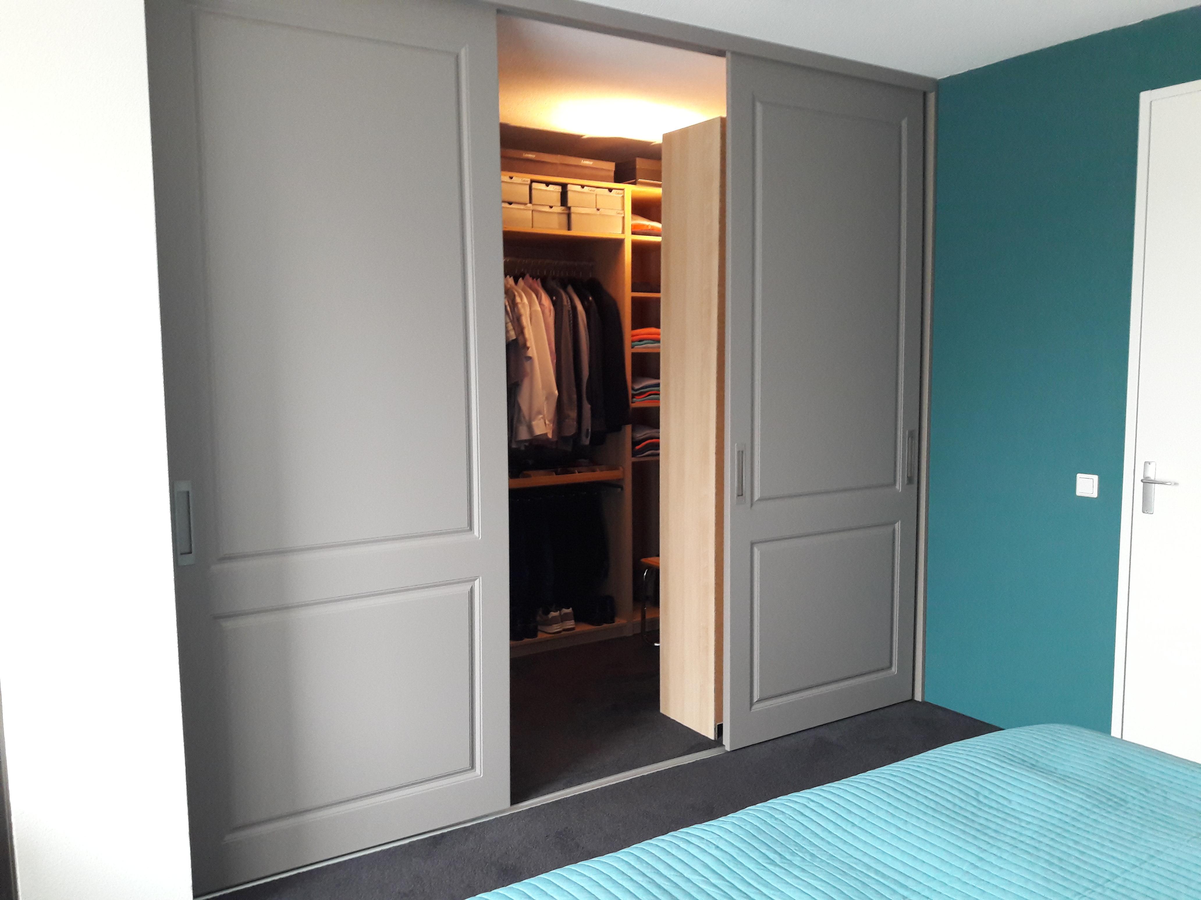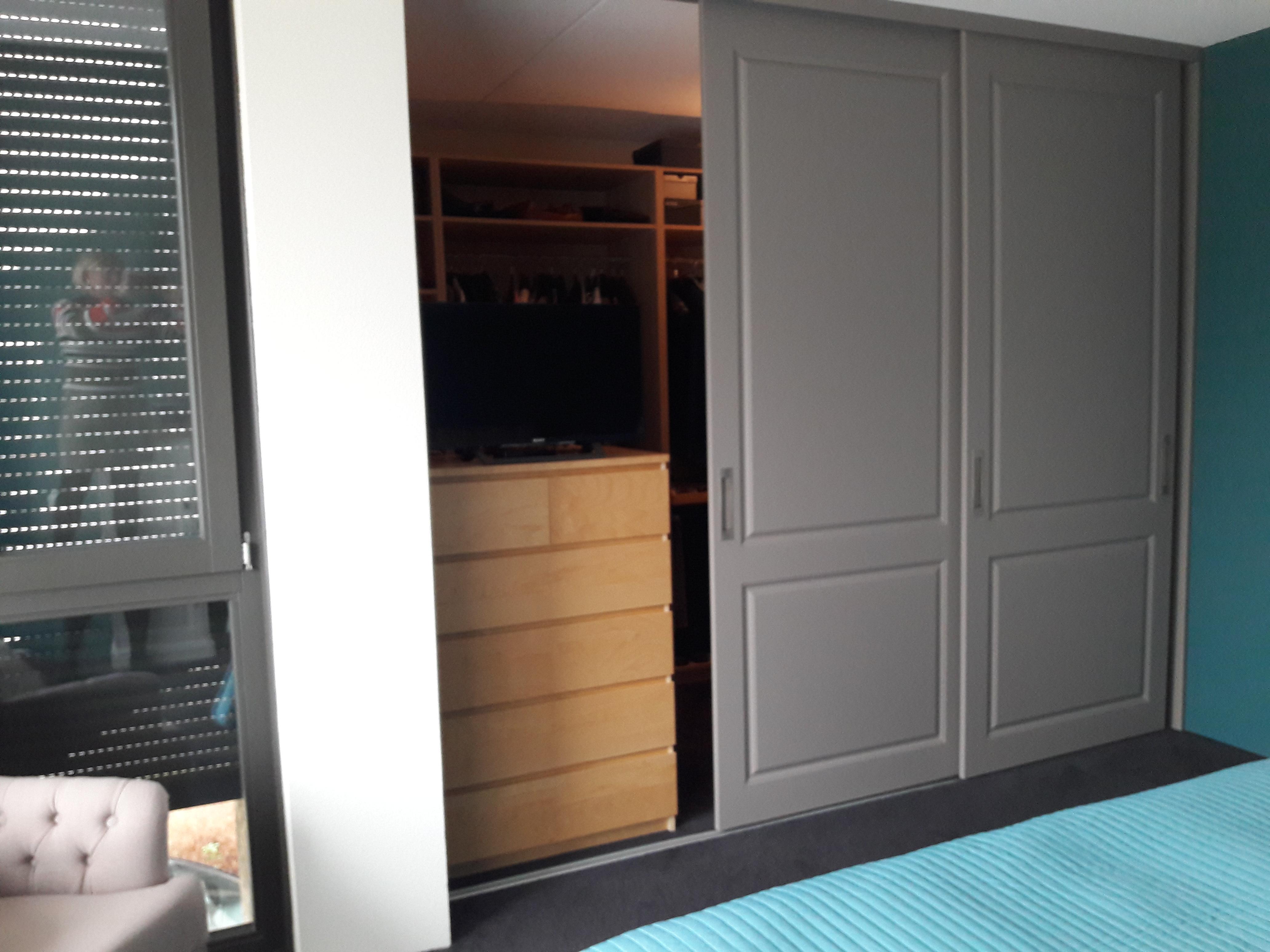 In deze slaapkamer is gekozen voor warme beige tinten gecombineerd met turquoise. Het gecapitonneerde hoofdbord van het bed geeft de ruimte een romantische uitstraling. De verrassing van deze slaapkamer is de mooie kastenwand met daarachter een walk-in closet, met onder andere de televisie. Door de schuifdeuren is de ruimte eenvoudig af te sluiten, zodat de slaapkamer altijd opgeruimd is.